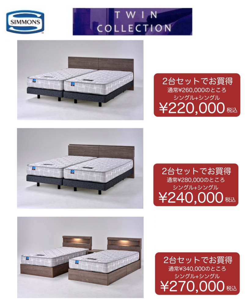 シモンズやシーリーなど、ブランドベッドのお得なツインセットや